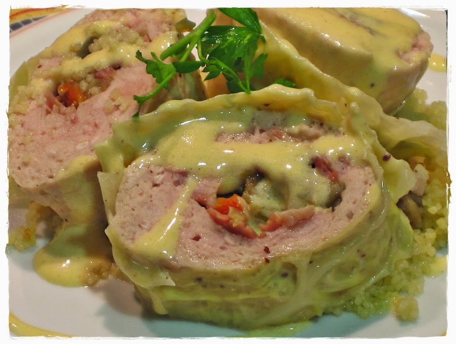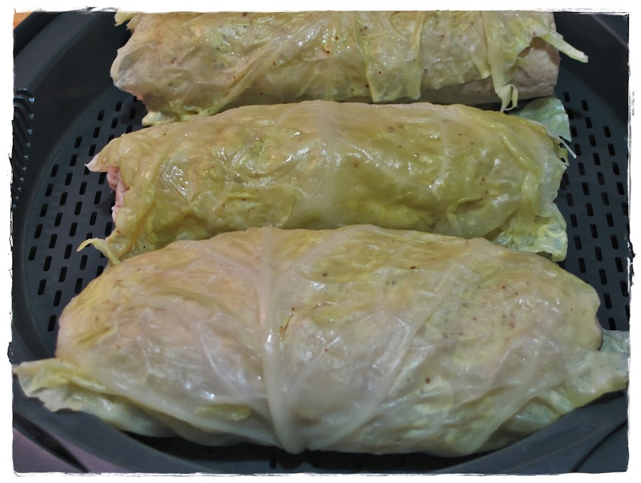 Si no tenéis Thermomix no pasa nada, tranquilos, que yo la primera vez los hice sin ella. En este caso tendréis que cocer los rollitos en agua hirviendo (envueltos en el film, claro) unos 15 minutos. Pasado este tiempo, hacemos la misma operación, les quitamos el film, los untamos con Dijonaisse y los envolvemos en el repollo y los terminamos al vapor en un recipiente apto para este tipo de cocción sobre una cacerola con agua durante 10 minutos.