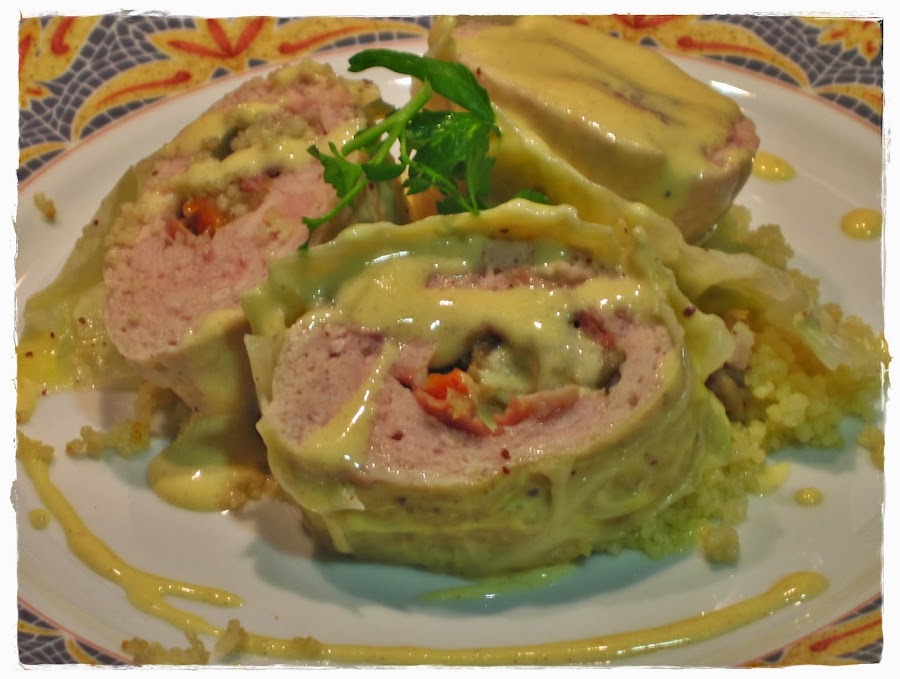 2 kgs de pollo (yo elegí contramuslos deshuesados, dan más trabajo pero son más jugosos); 1 paquete de queso de rulo de cabra; unas gotitas de Tabasco rojo; 1 berenjena; 1 calabacín pequeño; 2 zanahorias; 1 puerro; 3 lonchas de jamón serrano de calidad o taquitos de jamón; 6 hojas de repollo; Dijonaisse (mayonesa de mostaza); sal; pimienta negra molida; agua;