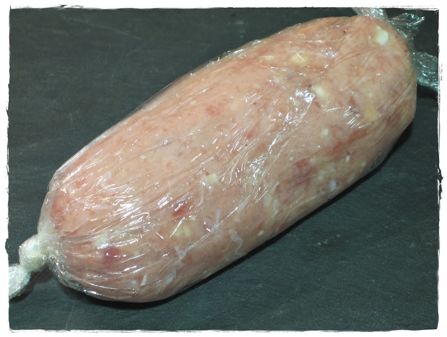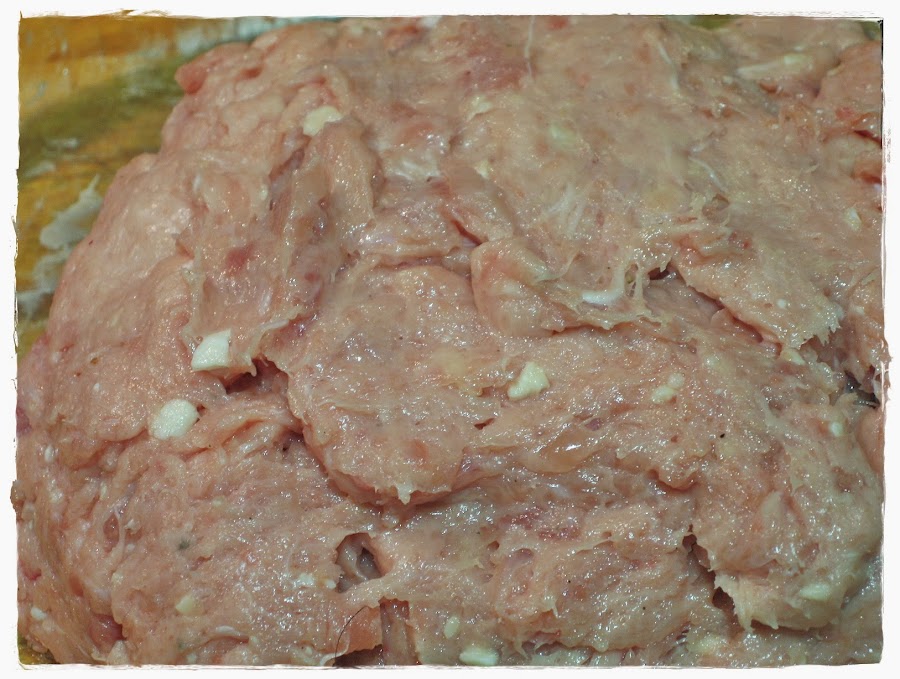 Ahora, formamos bolitas del mismo peso, unos 200 grs aproximadamente por persona, cortamos un trozo de papel film y lo ponemos sobre la superficie de trabajo. Ponemos el pollo encima y formamos un rectángulo lo más igualado posible, como podéis ver en la siguiente foto: