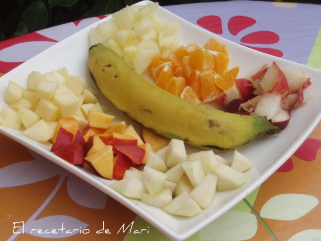 Lo primero que haremos es preparar la fruta. La manzana la pelamos, quitamos el corazón, al igual que una de las naranjas. La pera y el melocotón lo lavamos bien. Troceamos en brunoise toda la fruta (manzana, pera, piña, melocotón y naranja).