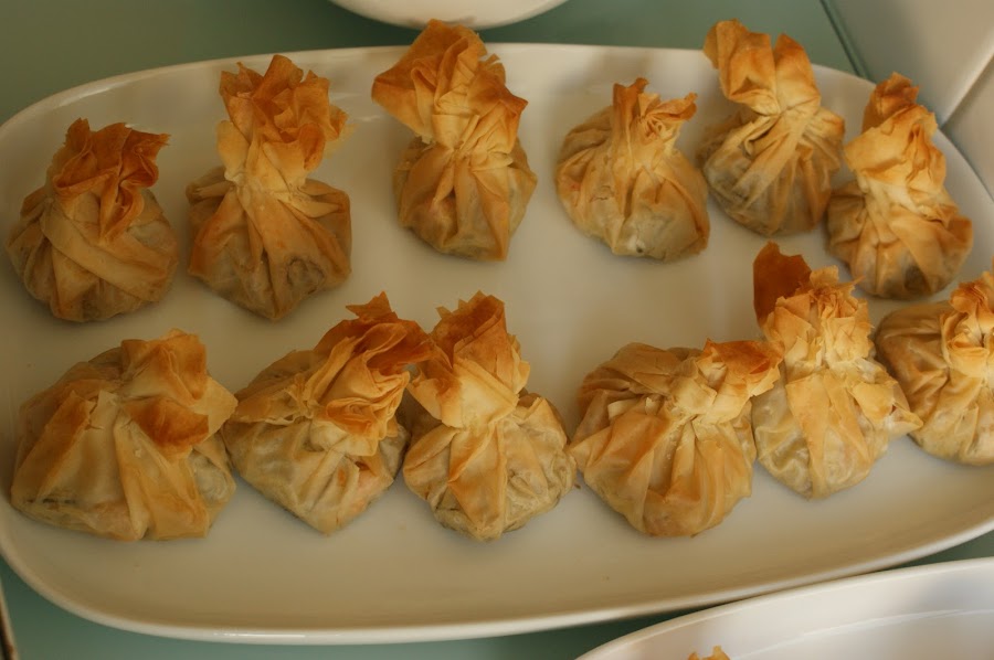 Con la pasta filo hacemos unos cortes, de forma que cada hoja cuadrada quede cortada en 4, para cada saquito pondremos 2 o mejor 3 cuadraditos de la pasta filo unos encima de los otros para que no se nos rompan en el horno,los pincelamos con un poco de mantequilla fundida, ponemos en el centro un poco del revuelto de angulas sucedáneas y gambas bien escurrido,y cerramos los paquetes,uniendo los bordes y enrrollando con hilo de cocina o con cebollino, yo para el horno los ato con hilo de cocina y al sacarlos se lo corto y los ato con el cebollino que queda más aparente.