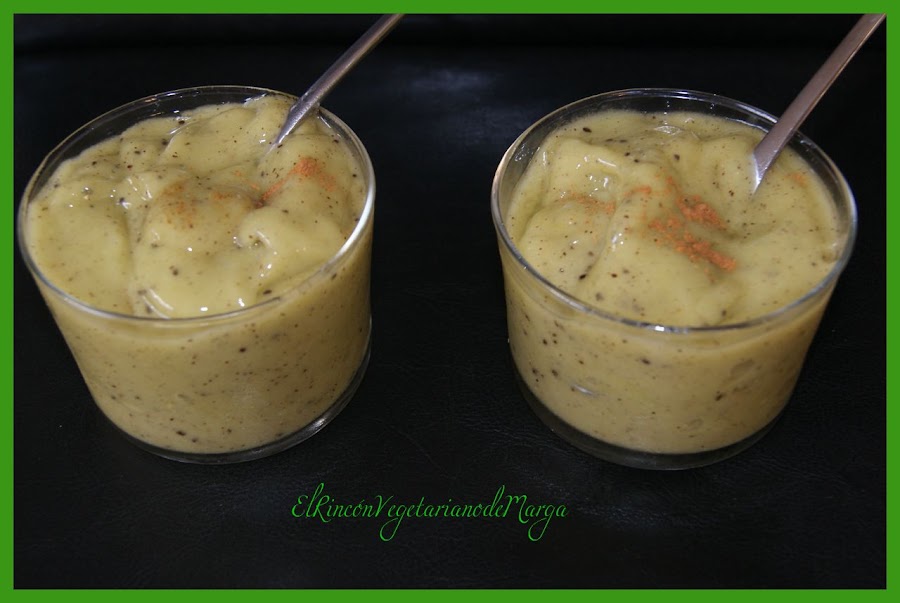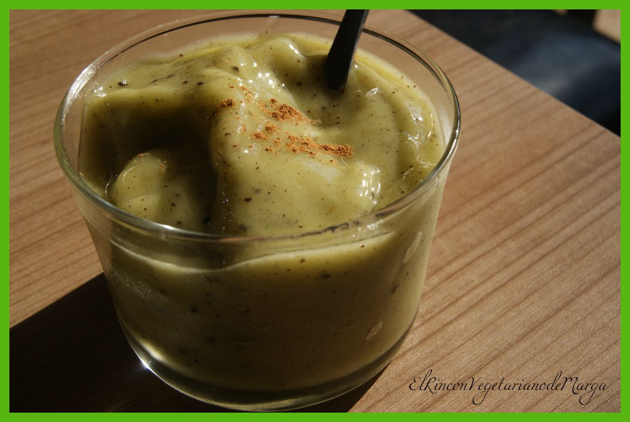 Sacamos los kiwis congelados y los metemos en un vaso de batidora, le añadimos un poco de agua para poder triturar mejor, una cucharada de canela y dos o tres cucharadas de sirope para endulzar. Batimos el tiempo necesario, hasta que queden todos los kiwis triturados. Quedará una mezcla homogénea y densa. Se debe consumir rápido, ya que en pocos minutos se derrite. Las fotos que he puesto son de al cabo de unos minutos (cuando ya me había comido uno ;))