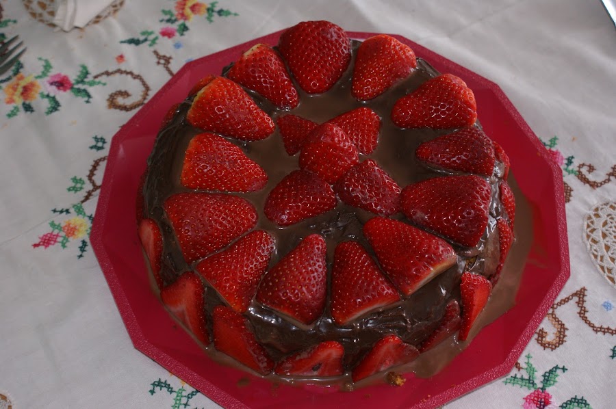 Picar en trozos algunas fresas y mezclar con un poco de la disolución de leche y chololate, extender sobre la mitad del bizcocho, tapar con el otro disco y extender en la misma dirección siempre el resto de la mezcla, adornar con las fresas restantes como más os guste.