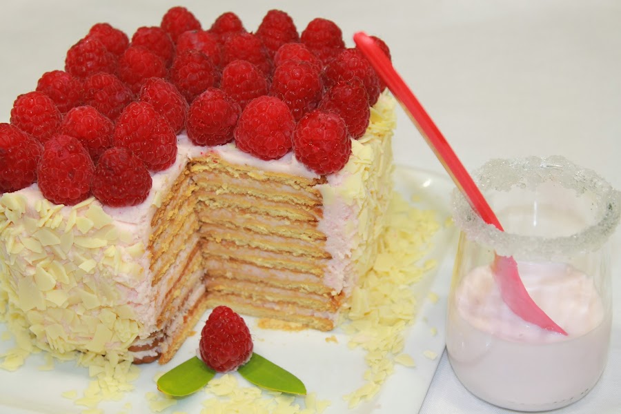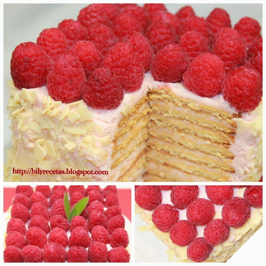 El montaje es bien sencillo, necesitamos un recipiente (en mi caso un tuper forrado de papel film, luego desmolda perfectamente para decorar la tarta el día siguiente) y poner la nata (crema de leche) en el congelador 5min antes de empezar a montarla. Mezclamos en un bol el queso mascarpone, el azúcar glas y la pasta de frambuesas y batimos bien hasta que quede todo muy cremoso y ligero y reservamos aparte. En otro bol batimos la nata (crema de leche) muy fría y juntamos las dos cremas con la ayuda de una cuchara o lengua de cocina. Empezamos montando la tarta mojando por un par de segundos las galletas en la leche fría y hacemos capa de galletas, capa de crema y así hasta agotar los productos siempre acabando con capa de crema. Dejamos reposar una noche en la nevera y el día siguiente decoramos a gusto - en mi caso chocolate blanco en los laterales y las frambuesas frescas encima.