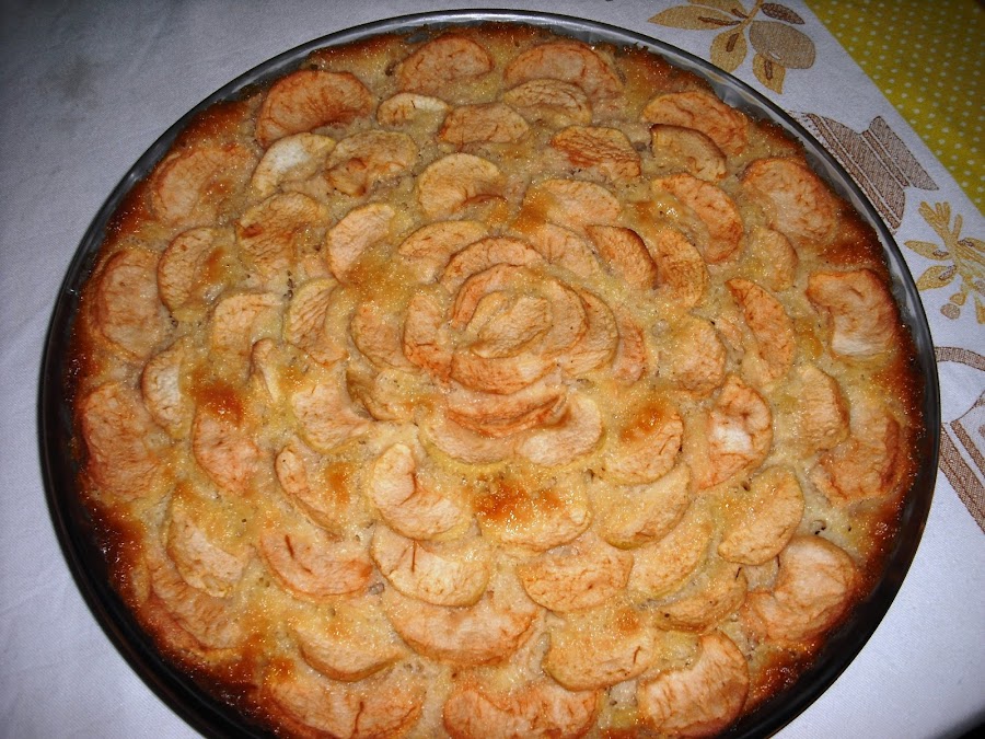 Poner la mezcla en un molde para tartas engrasado y decorar con las otras manzanas cortadas en gajos.