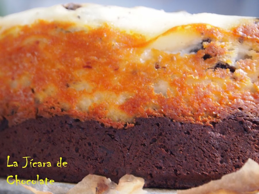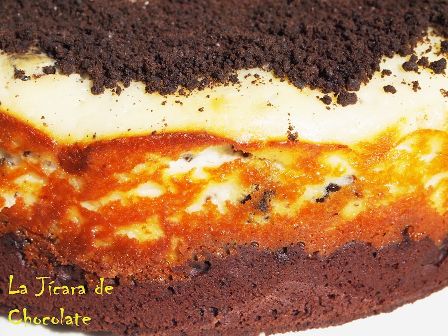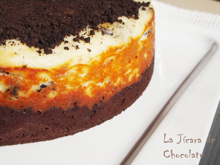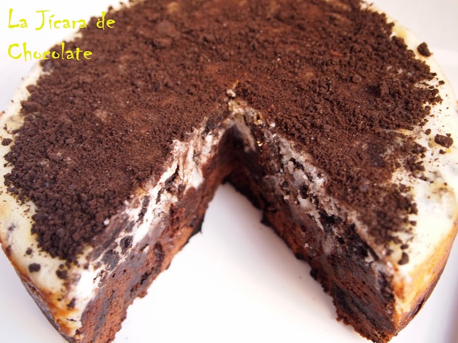 La mitad de la tarta es un Brownie con galletas Oreo y la otra mitad es una tarta de queso con galletas Oreo también.