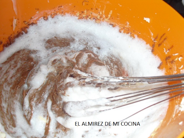 Montamos las claras a punto de nieve con el azúcar en grano . Se las vamos añadiendo a la mezcla anterior con mucho cuidado y en varias veces.