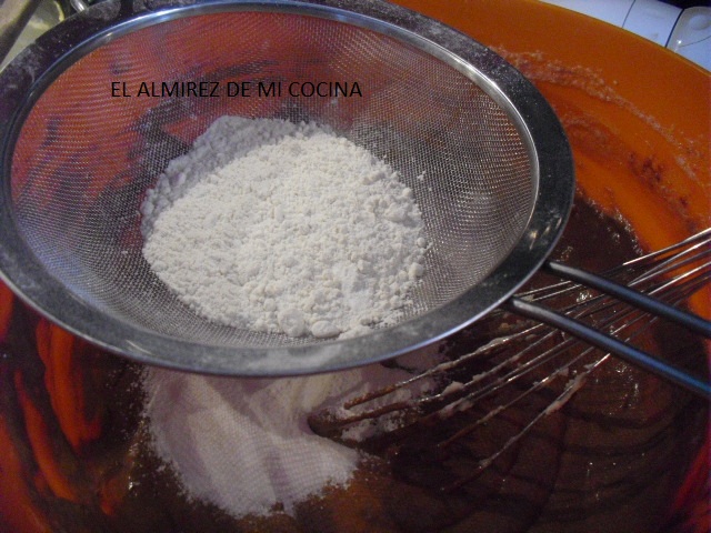 Le añadimos la harina tamizada con la levadura y mezclamos.
