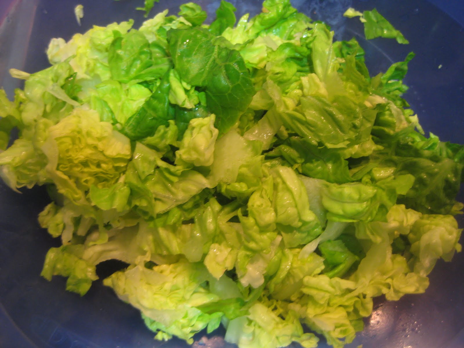 En un bol grande o ensaladera vamos haciendo la mezcla del relleno..Empezaremos con unos cogollos de lechuga cortaditos en juliana..