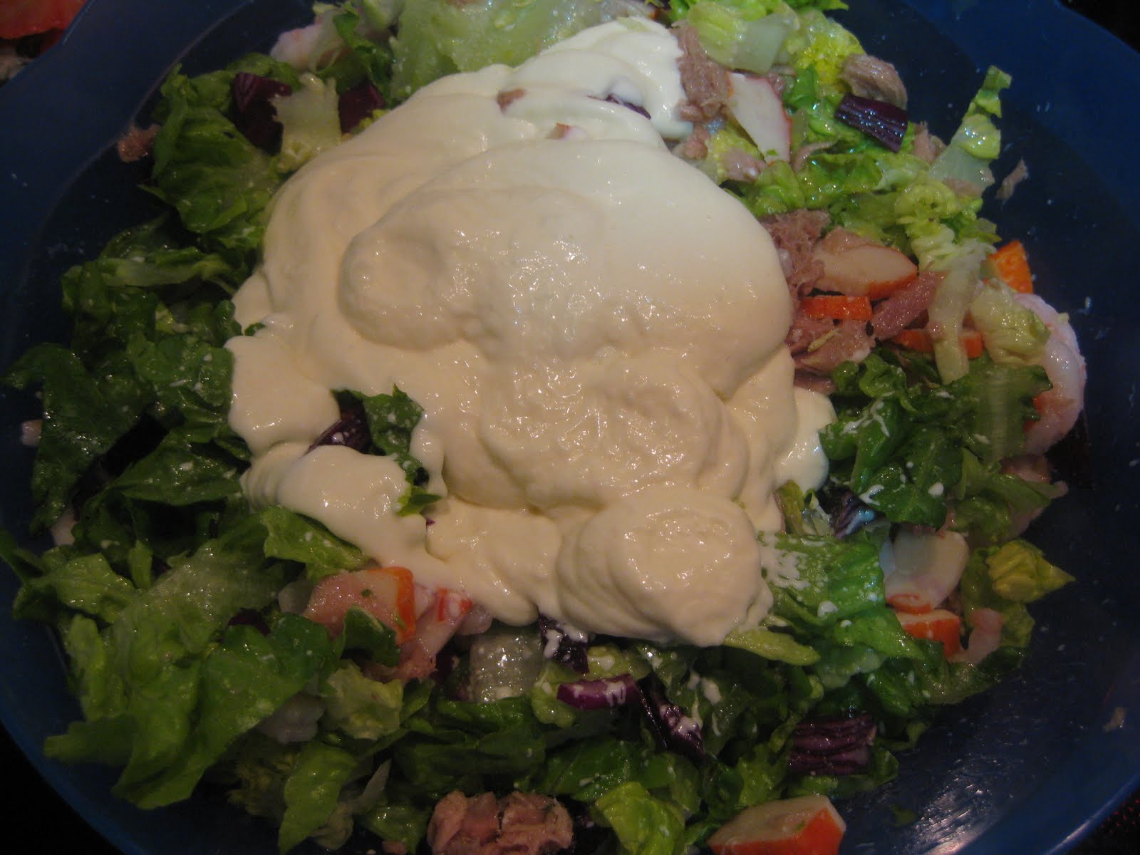 Yo aún le hubiese añadido más cositas como maíz o espárragos pero los tomates tampoco eran tan grandes..así que pondremos mayonesa para hacer una mezcla más compacta y poder rellenar los tomates más fácilmente..