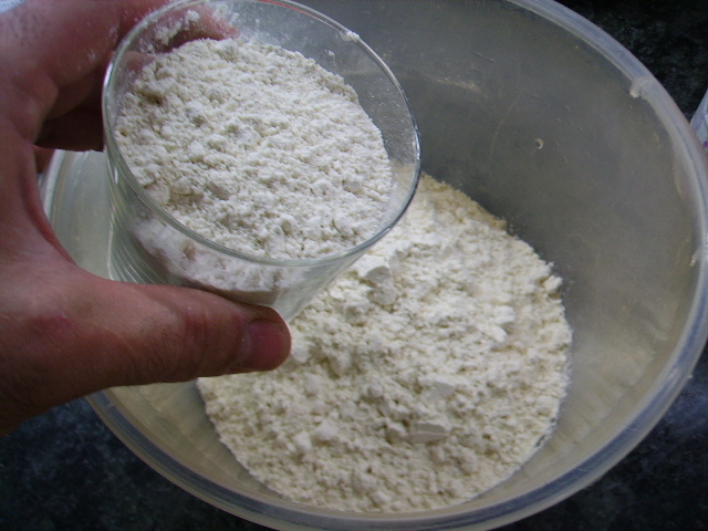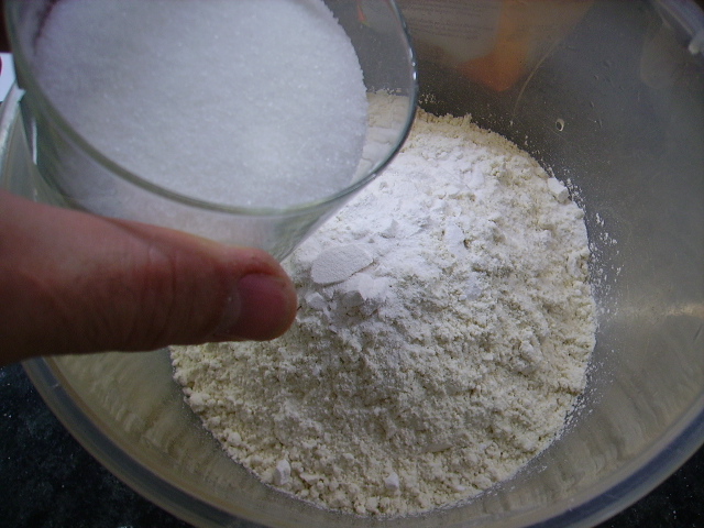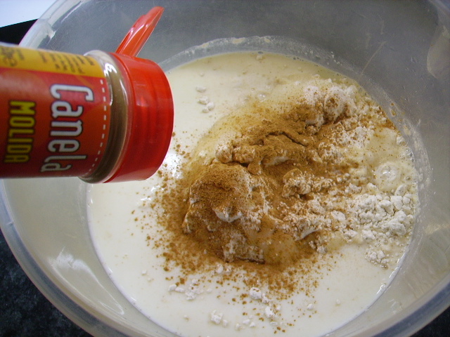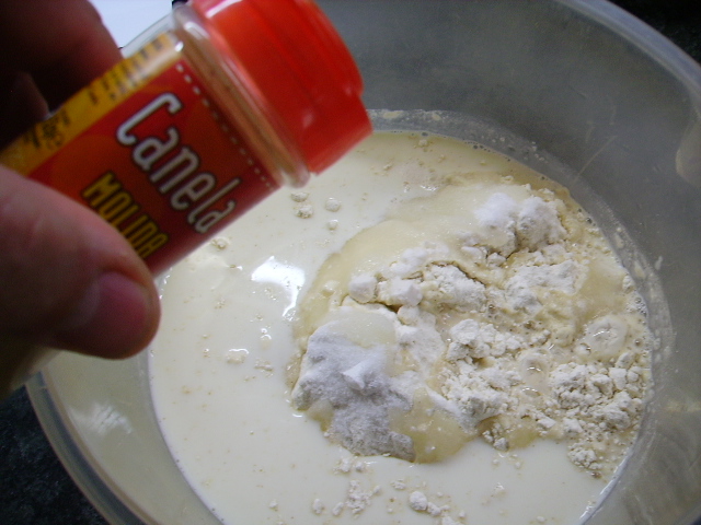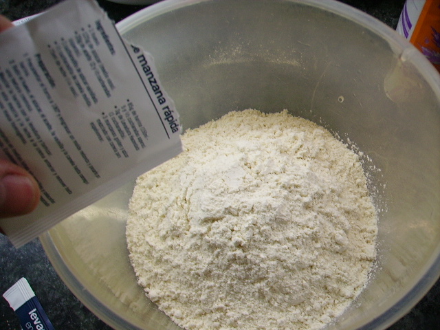 2.- En un bol ponemos la harina, la leche, el azucar y la levadura y amasamos todo con una paleta.