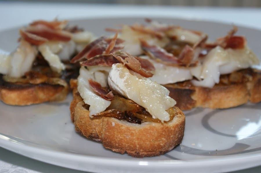 MONTAR: Poner sobre la rebanada de pan la cebolla confitada, sobre ella el bacalao y encima el jamón, meter al horno un par de minutos.