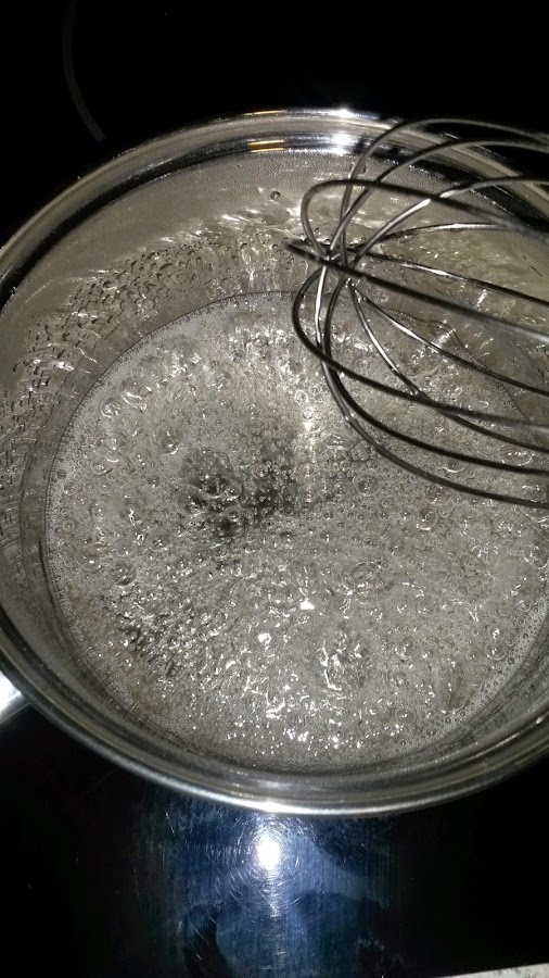 - Una vez tengamos nuestras claras montadas vamos a preparar un almíbar espeso, y para ello, calentamos los 50 gramos de agua junto con 130 gramos de azúcar, a fuego medio-alto (mi vitro tiene 9 puntos de intensidad, y lo puse en el punto 7). Lo dejaremos al fuego, sin dejar de remover, hasta que nuestro almíbar espese (hay recetas que hablan de un termómetro de azúcar, y de que el almíbar está listo cuando alcanza unos determinados grados, pero mi premisa es hacer repostería sencilla y al alcance de todos los públicos y bolsillos, jejejeje). Veréis claramente cuándo está listo, porque espesa bastante, y si no os fiáis, yo me guié por las "burbujitas" que se aprecian en el almíbar, que no deben ser muy grandes, os pongo una imágen (que vale más que mil palabras, ¿no?)
