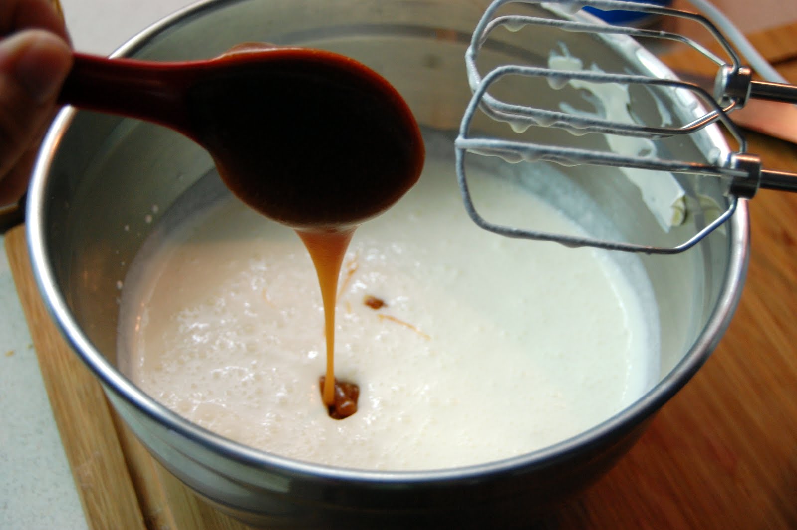 Batir ligeramente la nata (crema de leche) ,en cuanto espese un pelín ,añadir las dos cucharadas de crema de caramelo y el queso mascarpone, batir un poco mas ,vereis como enseguida coge cuerpo, ese es el momento de dejar de batir, si no puede quedar demasiado espeso.
