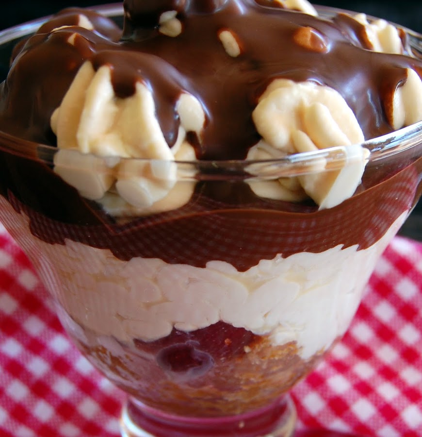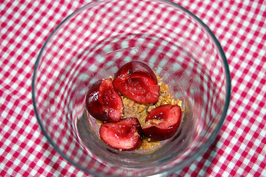 Poner una cucharada del picadillo de galletas en el fondo , lavar y deshuesar dos cerezas ,dejarlas caer sobre el lecho de galletas.