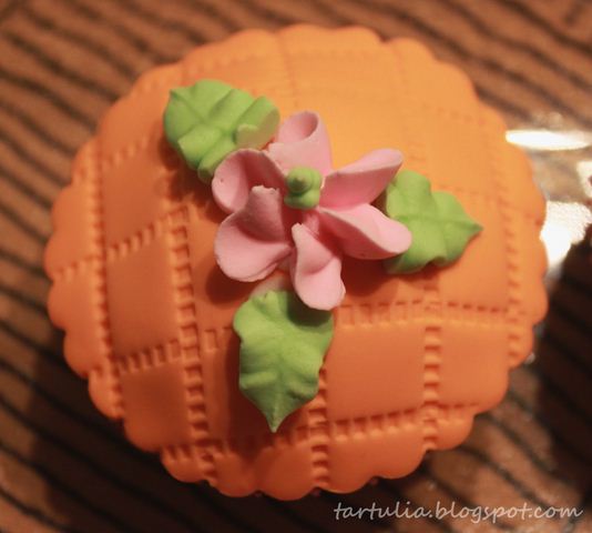 Las seis últimas las unté también con ganache y las decoré con fondant en dos colores, naranja y blanco, utilicé un cortante con forma de ondas y le hice unas marcas formando una especie de acolchado, les puse las flores y hojitas de glasa y estas también me las llevé al trabajo. Volaron enseguida