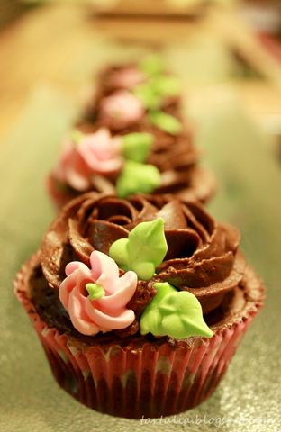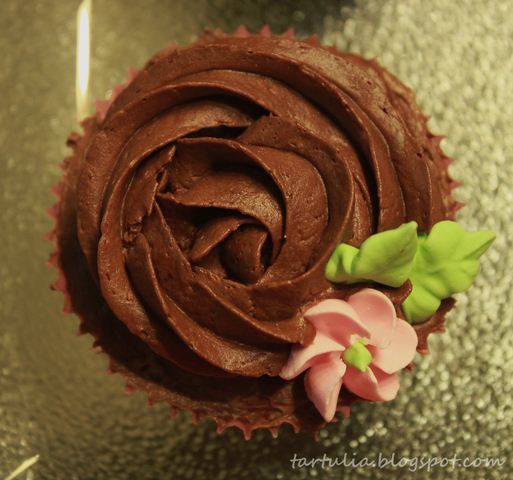 Decoré las seis primeras con ganache de chocolate negro (receta aquí), formando una rosa grande con
