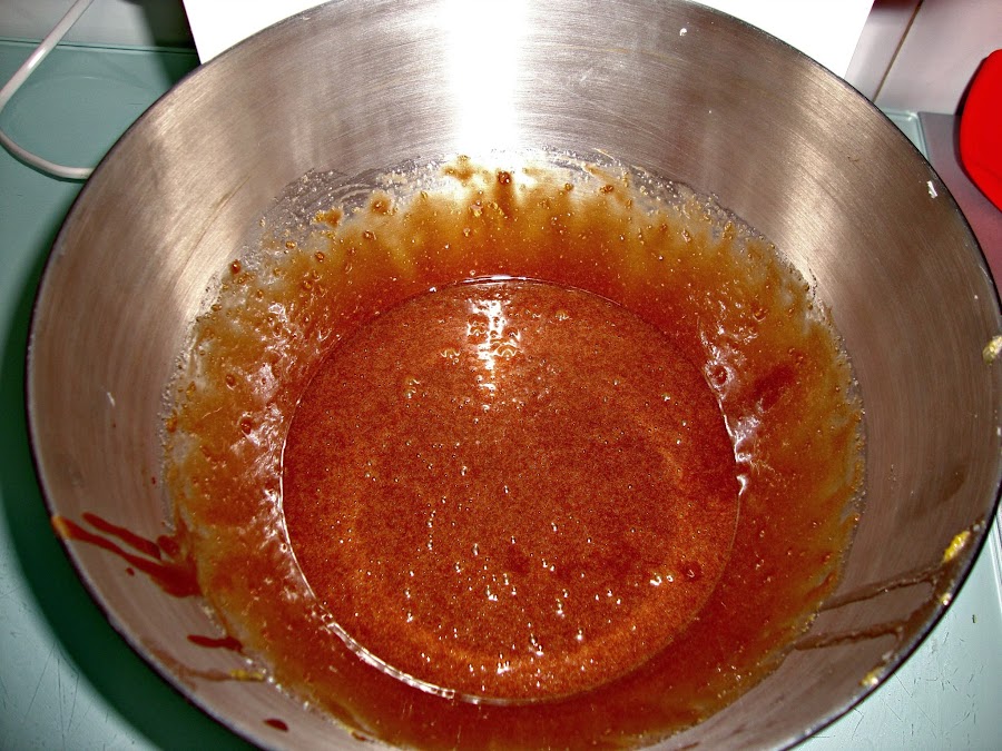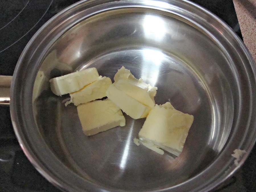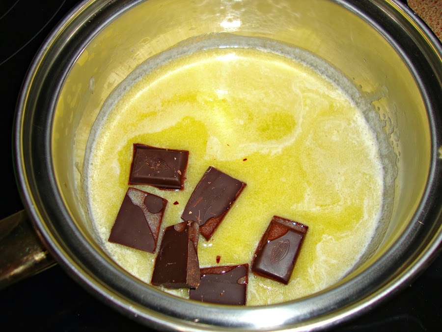 En otro cazo de pone la mantequilla a temperatura media hasta que se deshaga y luego se retira del fuego y se le añade el chocolate y se mezcla hasta que quede todo disuelto y homogéneo.