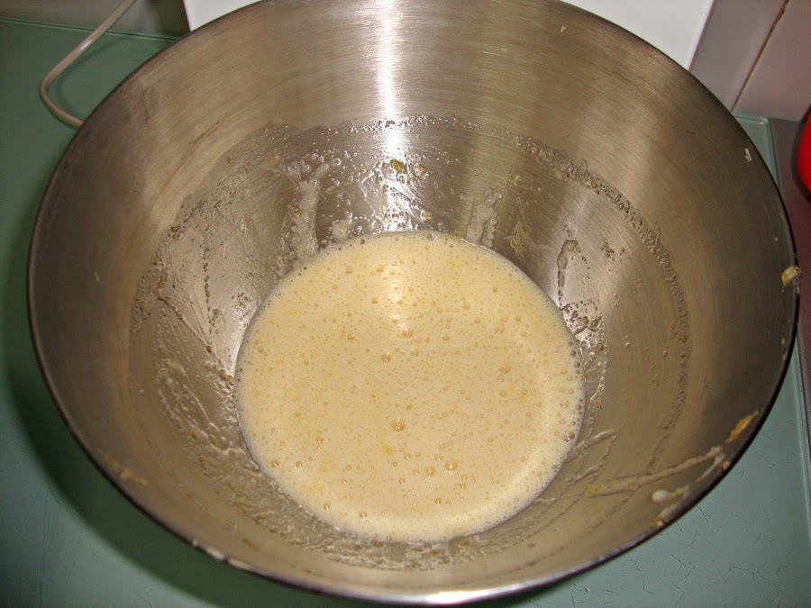 Luego se le añade con un chorrito fino y lentamente la mezcla de mantequilla con chocolate y luego se va alternando la harina (tamizada con la levadura) con la leche.