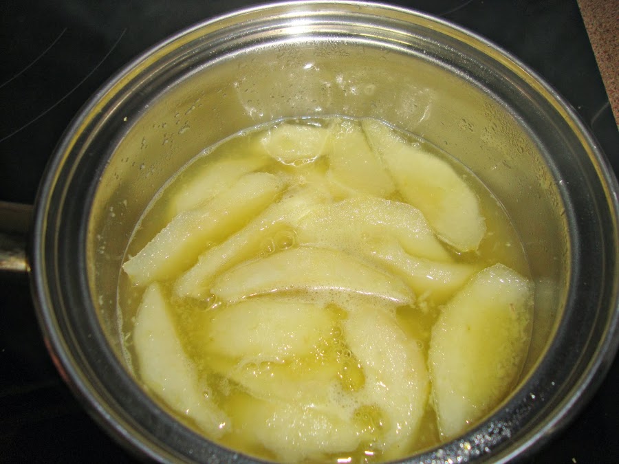 Pelamos las peras y las cortamos en gajos, las ponemos en un cazo con la ralladura del limón, dos cucharadas de zumo de limón, el zumo de manzana y dos cucharadas de azúcar ( de la que tenemos pesada), lo llevamos a ebullición y dejamos cocer durante 5-6 minutos (que se queden enteras), luego se escurren y trocean.