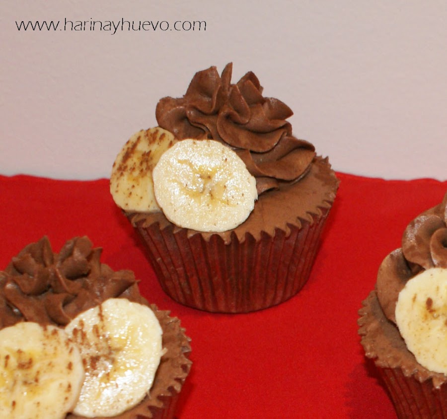 Ahora para decorar colocamos un poco de buttercream en el mismo cupcake para hacer la superficie regular y con una manga pastelera y la boquilla 2D decoramos haciendo copete. Cortamos unas rodajitas de plátano que ponemos encima y echamos un poco de cacao en polvo y... uhmmmm... listo ¿quién puede resistirse?