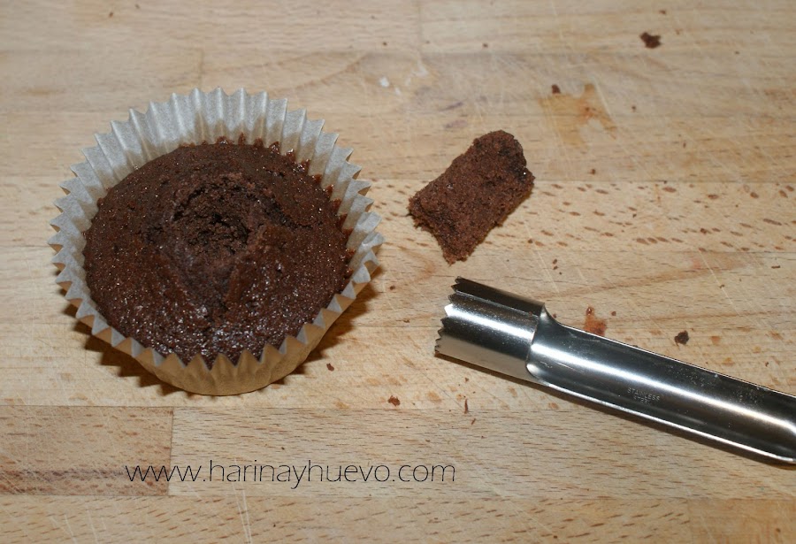 Una vez sacados los dejamos reposar en la misma bandeja no más de 5 minutos y los pasamos a una rejilla. Cuando estén fríos usamos un descorazonador de manzana para extraer la parte central, cortamos un poco del bizcocho sacado y colocamos una tapa.