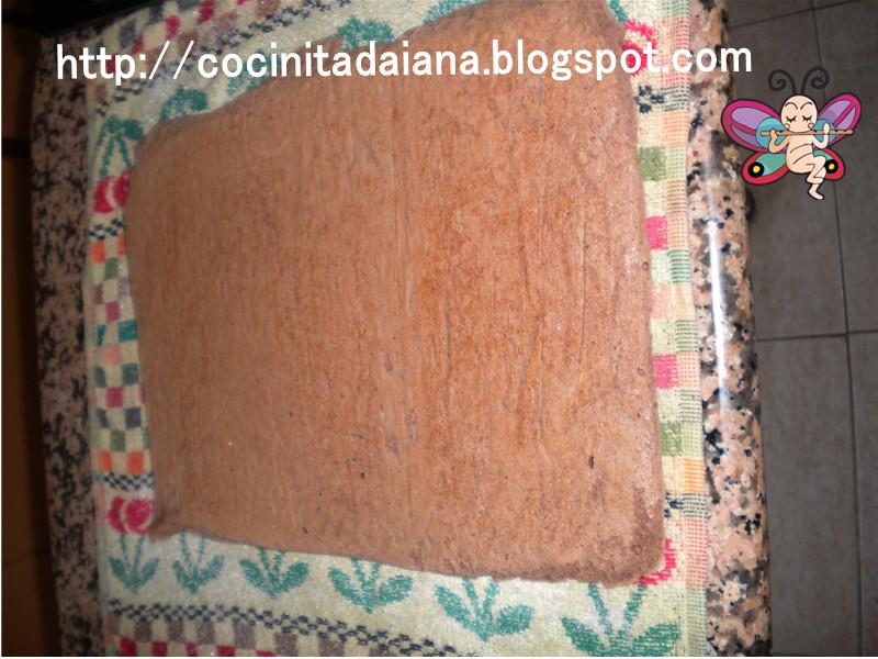 4) Mientras se cocina la masa, humedeceremos un paño de cocina, lo estiramos sobre la mesa y lo espolvoreamos con azúcar, para colocar la masa ahí cuando la retiremos del horno. Si se quiere enrollar, debeis enrollarlo con el paño por el medio para que se enfríe, y así cuando queráis podáis rellenarla sin que se os rompa.
