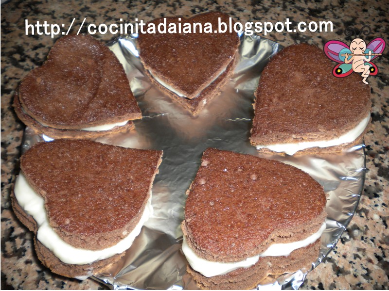 Quería hacer algo original y tanto pensar, se me ocurrió improvisar un poco... He preparado la masa de un brazo de gitano de cacao, y le he cambiado la forma, en lugar de hacerlo arrollado, lo he hecho en forma de corazones.