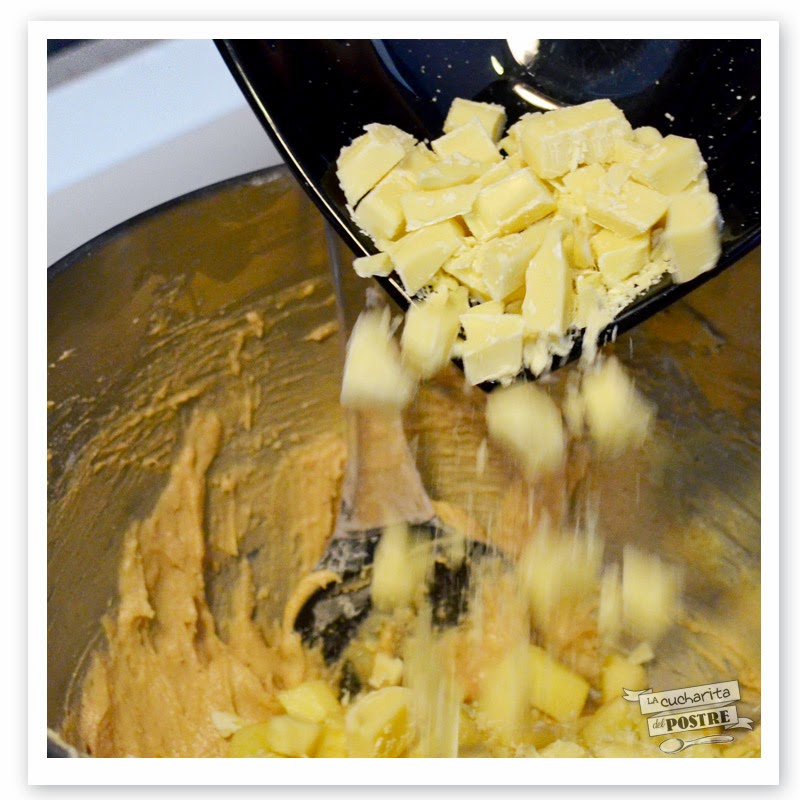 10. Incorpora los chips de chocolate blanco. Si no los encuentras en la tienda, como ha sido mi caso, puedes hacerlos cortando chocolate blanco en trozos pequeñitos.