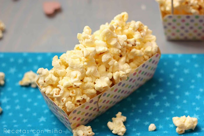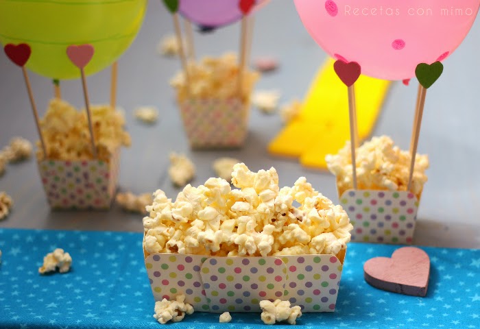 Me encantó la idea de los globos aerostáticos como hilo central de mi propuesta, porque... a qué niño no le encantan los globos? y si hacía globitos de ración para cada pequeño invitado? Además esos globos nos podrán llevar a Oz, aunque sólo sea con la imaginación. Así nació la idea... que la fui elaborando casi a la vez que me encontré con estas Palomitas de chocolate blanco. Me fascinó sólo con imaginar lo rica que tenía que estar esta combinación. La verdad que no soy demasiado fan de las palomitas dulces de colores. Pero éstas que os traigo no tienen nada que ver. Están dulces, claro está, pero tienen la suavidad de la capa de chocolate blanco que las recubre, se deshace en la boca a la vez que cruje la palomita al morderla. Ningún niño se resistiría a este picoteo festivo... y menos aún si después cada uno tendrá un globito decorado para jugar. Una idea divertida para una fiesta infantil.