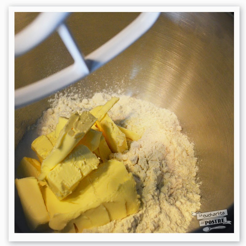 4. Por último, añade la mantequilla, que debe de estar muy fría. Si está a temperatura ambiente o muy blandita, se integrará enseguida con la harina y se formará una masa muy poco consistente que no nos servirá para forrar el molde.