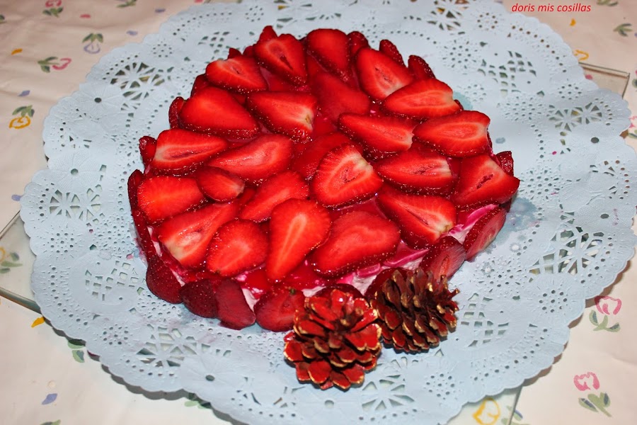 Una vez cuajada la gelatina de frambuesa, limpiamos las fresas cortadas a rodajas y adornamos la superficie y alrededor de la tarta.