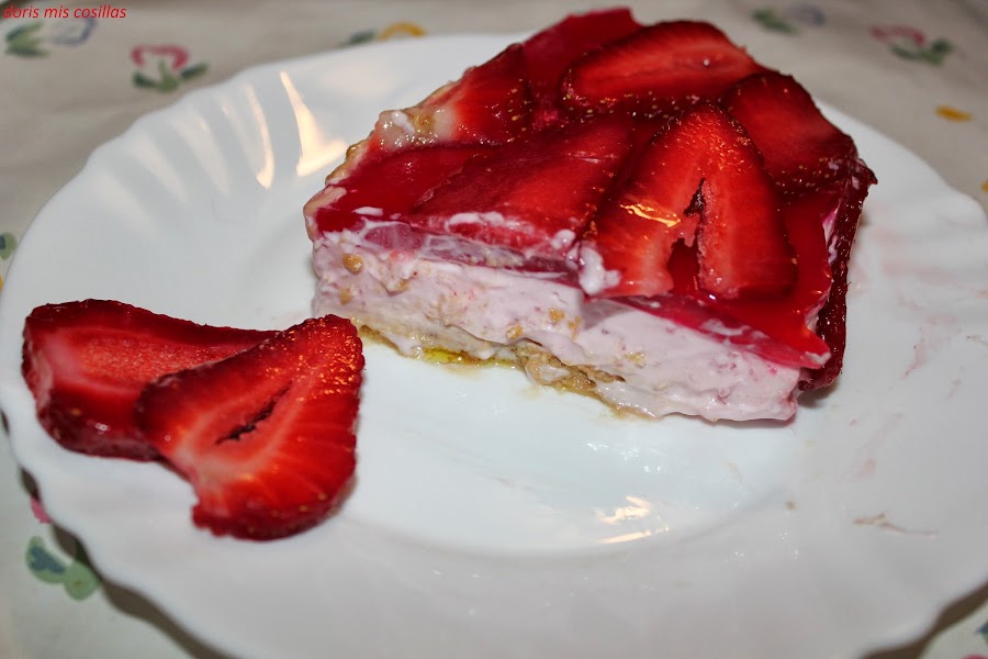 Una vez cuajada la tarta, Preparamos el otro sobre de gelatina de frambuesa en 200 c.c. de agua caliente, remover hasta disolver el azúcar que viene adjunta en el sobre, agregamos despacio a la tarta acompañándonos de un colador para que no caiga ningún residuo y dejamos cuajar unas horas en frío.