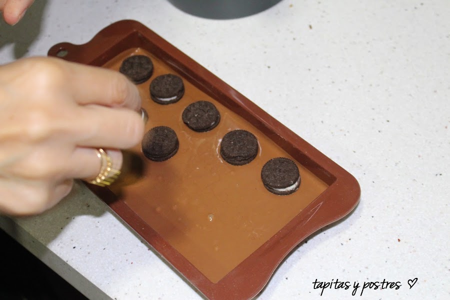 Sobre un molde de silicona verter parte de la mezcla, poner una capa de galletas oreos y completar con el resto del chocolate.