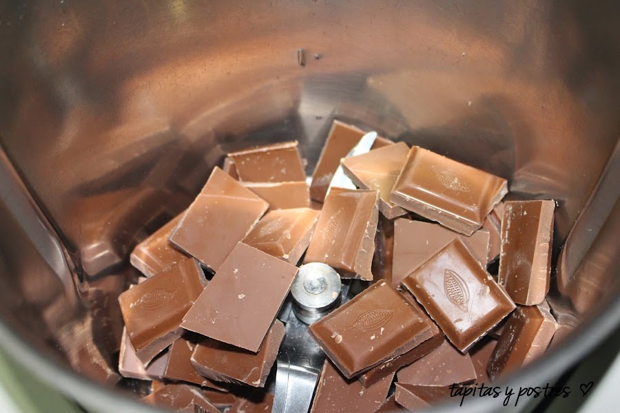 Trocear el chocolate y echarlo al vaso, triturar.5 segundos a velocidad 8-10.
