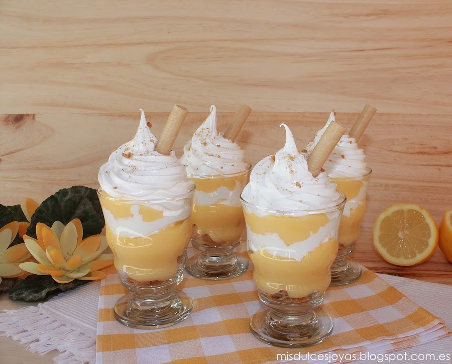 Por ese motivo la tarta inglesa de limón y merengue "Lemon Pie", es una de mis favoritas. La receta de esta tarta era una de las primeras que puse en el blog, y estos vasitos son realmente una versión de la misma. Se componen de unas capas de Lemon Curd (crema de limón inglesa), merengue y galleta desmenuzada. La galleta hace la función de la masa quebrada, que es la base de esta tarta. La verdad aunque parecen sencillos y simples os diré que están riquísimos, y no necesitan nada más, cualquier añadido les sobra.