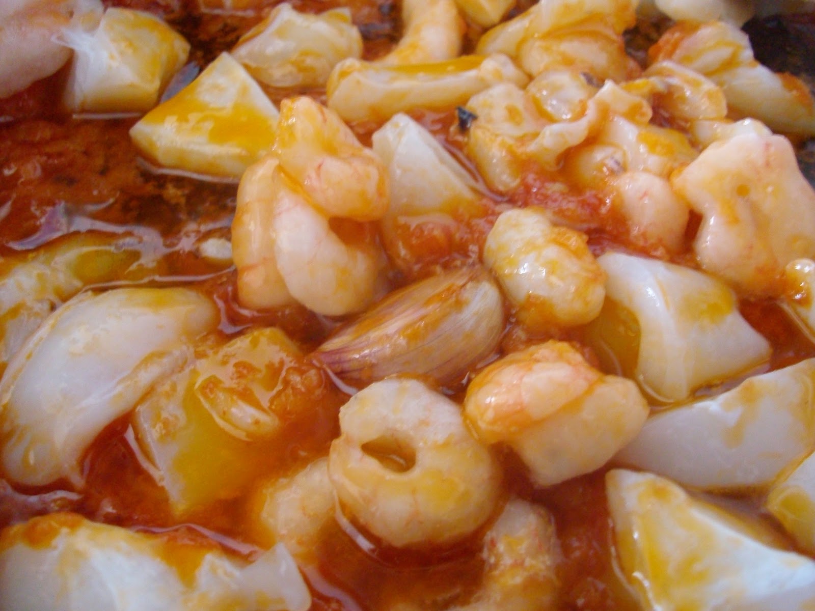 en una cazuela que se pueda poner la horno..ponemos un fondo de aceite y en el sofreimos la sepia cortada en trozos pequeños...los dientes de ajo y las gambas