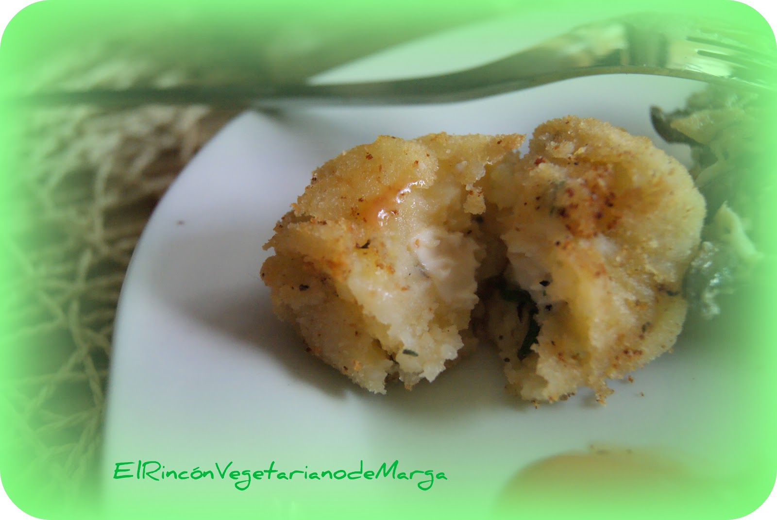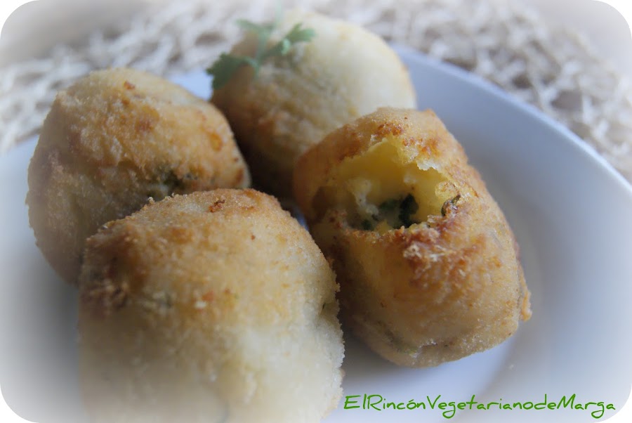 Lo dejamos enfriar para que solidifique y en este punto hacemos forma de bolita, con el dedo hacemos un agujero en la bolita y le añadimos un trozo de quesito, lo cerramos con un poco más de puré de patata. Pasamos las bolitas por galleta picada y las freímos en abundante aceite caliente.