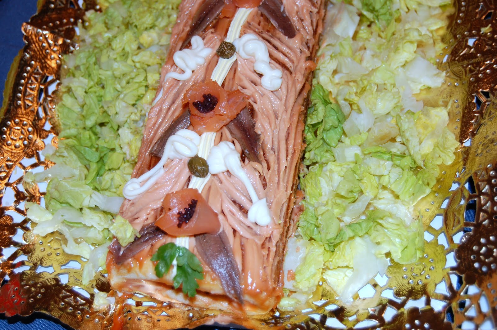 Hacemos unas rositas con el salmón, cortando tiras finas y enrollandolas en la punta del dedo ., seguimos decorando a nuestro gusto con el resto de anchoas y las alcaparras o pepinillos..
