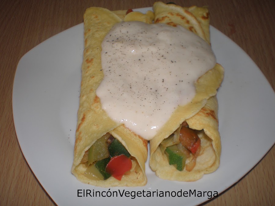 Ponemos las verduras cocidas en el interior de la crêpe y lo enrollamos. Añadimos por encima la bechamel. Riquísimo!! Para un primer plato está bien.