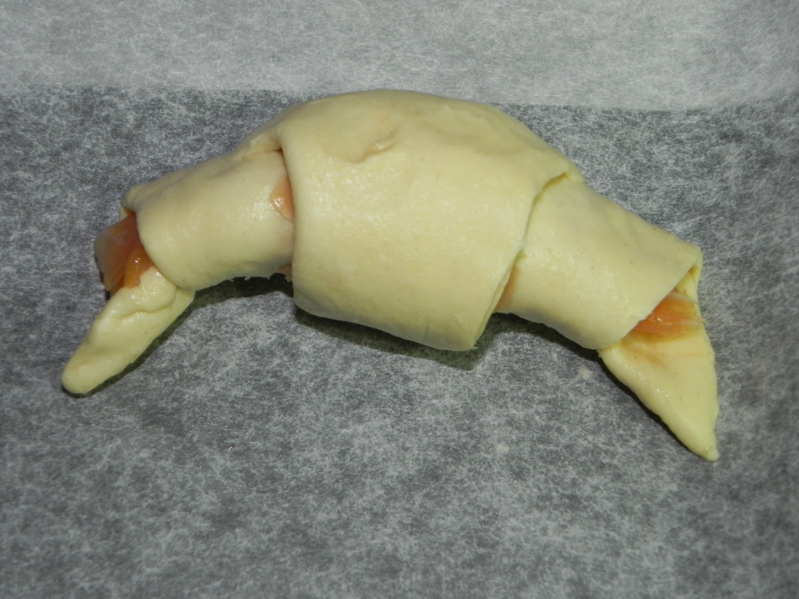 Enrollamos desde la parte ancha a la estrecha. Luego arqueamos un poco, para que tomen forma de C, la forma clásica de los croissants.