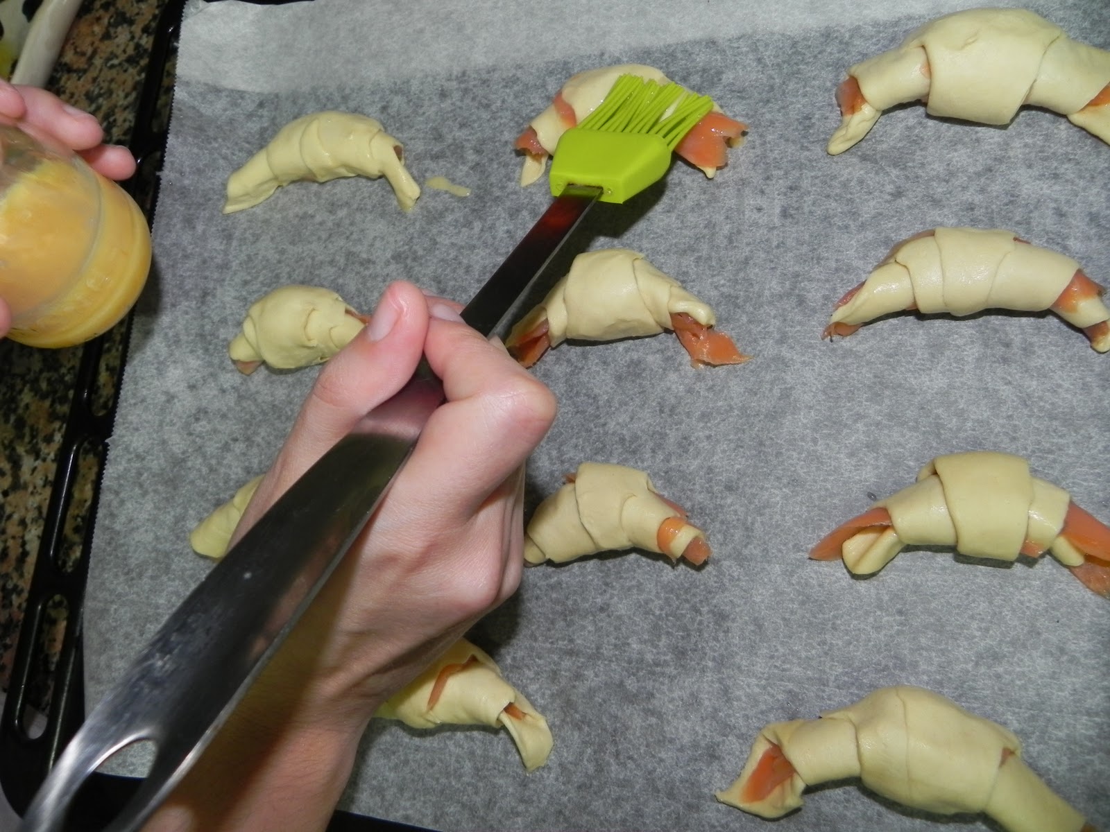 Los vamos colocando en una bandeja de horno donde habremos puesto un papel vegetal. Repetir la operación tantas veces como triángulos tengamos. Una vez los tengamos todos colocados en la bandeja los pintamos con el huevo batido y una brocha de cocina.