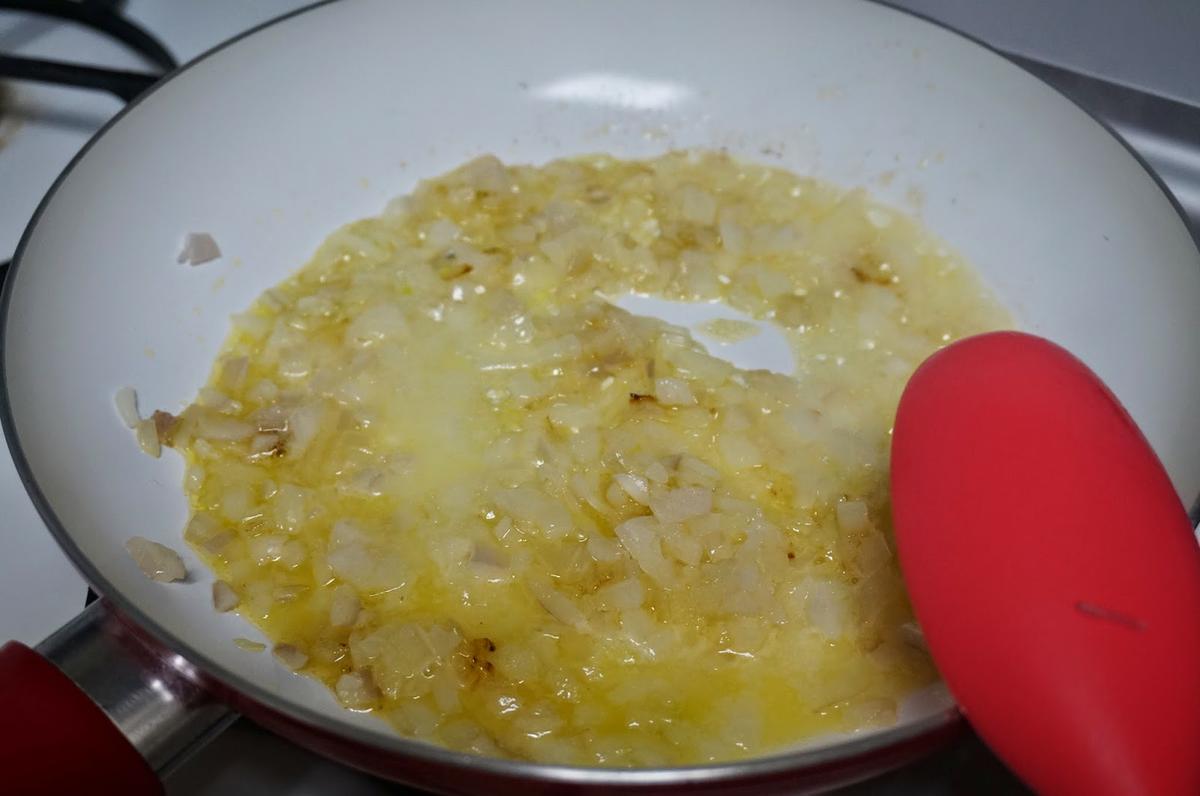 En una sarten ponemos a calentar el aceite junto con la mantequilla y echaremos la cebolla picada.