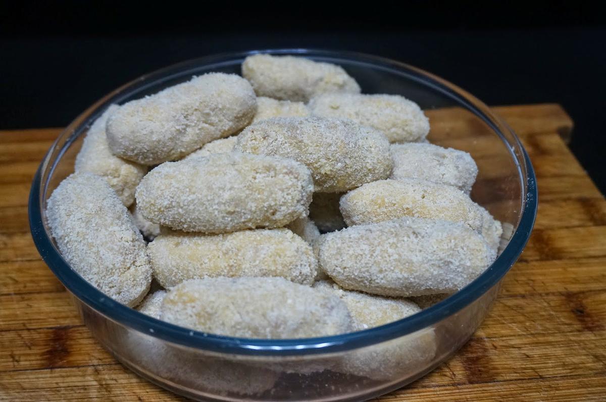 Prepararemos dos recipientes en uno pondremos los huevos batidos y en otro el pan rallado e iremos formando las croquetas. Primero lo pasaremos por huevo y luego por pan rallado.