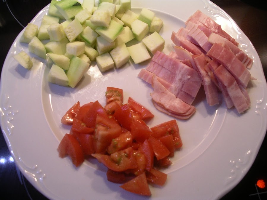 Pelar y picar en dados el calabacin y rehogarlo en una sartén junto con el bacon en tiras o dados. Si se hace con jamon de york no hace falta rehogar este.