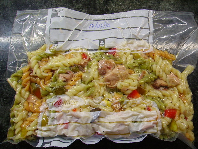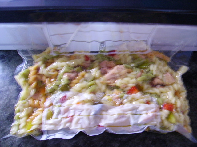 Nota: En este caso la vamos a envasar al vacío en raciones de 400grs. para conservar varios días en la nevera sin que coja sabores externos y conserve sus propiedades. (Ver fotos) He utilizado una máquina de envasar que compré en Lidl, pero que igual podemos encontrar en tiendas de electrodomésticos e hipermercados. Se trata de extraer el aire que rodea al producto que se va a envasar. De este modo se consigue una atmósfera libre de oxígeno con la que se retarda la acción de bacterias y hongos que necesitan este elemento para sobrevivir, lo que posibilita una mayor vida útil de la comida preparada. El envasado al vacío se complementa con otros métodos de conservación ya que después, el alimento puede ser refrigerado o congelado.
