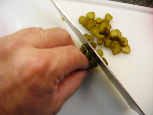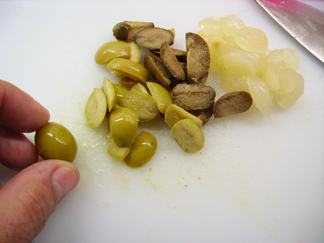 4.- Igualmente picamos los pepinillos, aceitunas y cebolletas.