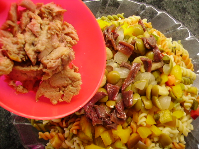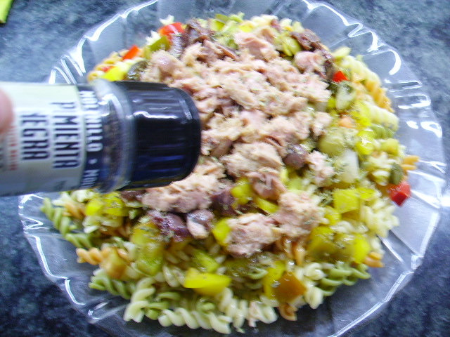 5.- Añadimos los pimientos y encurtidos picados a la pasta.