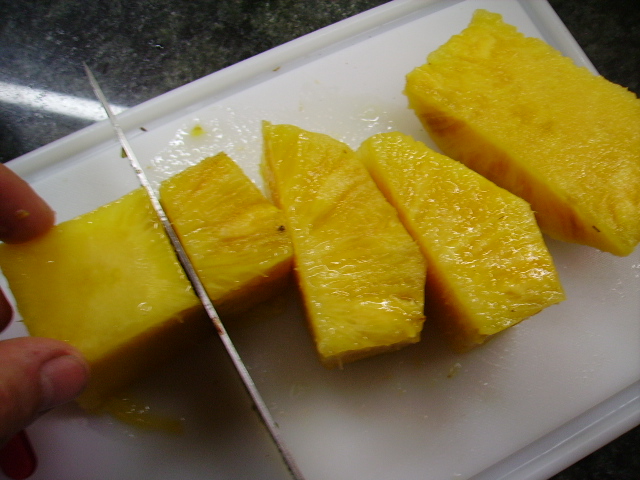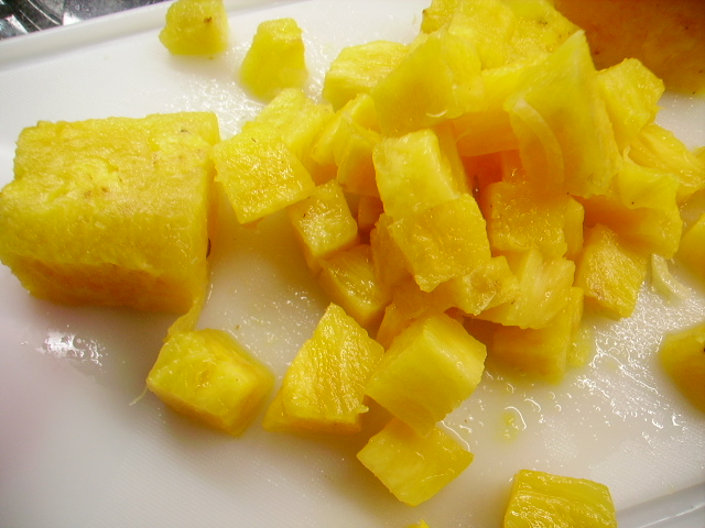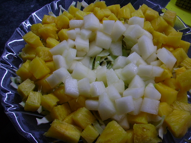 2.- Quitamos la piel a la piña y troceamos en dados. Colocamos alrededor de la col.