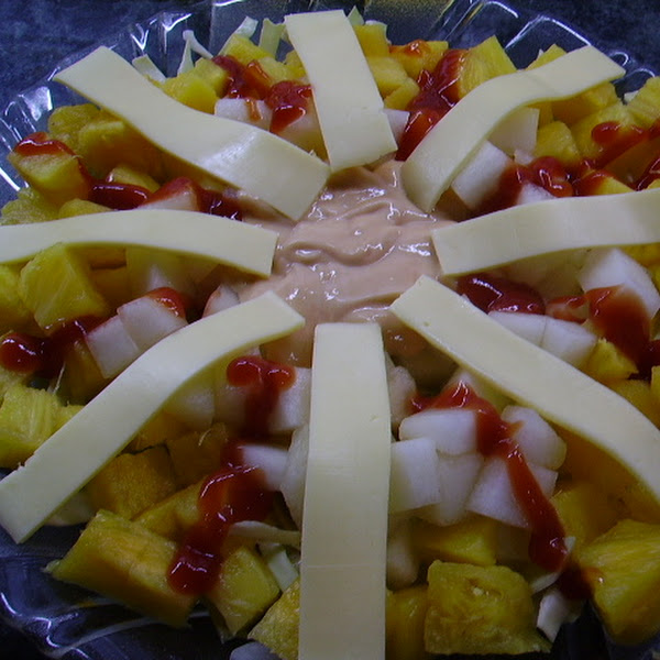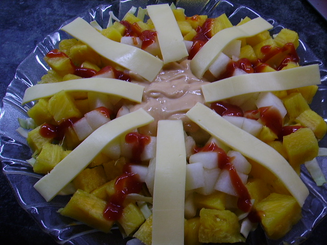 Bueno como últimamente tengo olvidadas las ensaladas, aprovechando que tengo un piña madurita, he preparado esta ensalada de frutas con un toque de gouda y todo ello bañado en mi salsa rosa rápida, que cada día me gusta más, por lo fácil que es de prepararla y el sabor que tiene.